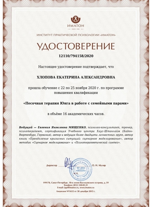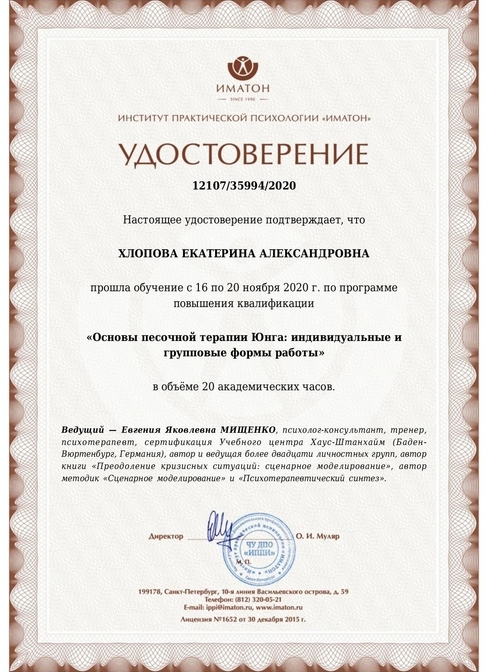 2021 г - Основы Песочной терапии Юнга. (52 часа) Институт практической психологии 'Иматон'