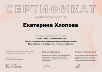 2022 г Курс "Профессиональная глубинная супервизия. Межмодальный подход. Теория и техники глубинной супервизии" (Сертификат ОППЛ, 92 часа). Аккредитованный супервизор Профессиональной Психотерапевтической Лиги с правом выдачи накопительных сертификатов ОППЛ