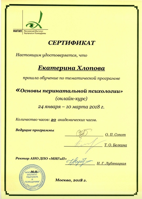 2018 г - Основы перинатальной психологии (20 ак.часов) МИГИП