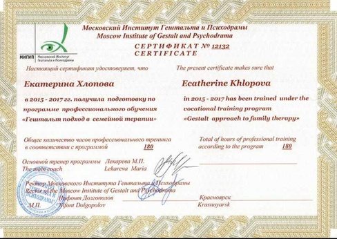 2017 г - Специализированная программа по работе с семьёй и семейными проблемами в гештальт-подходе (180 часов) МИГИП