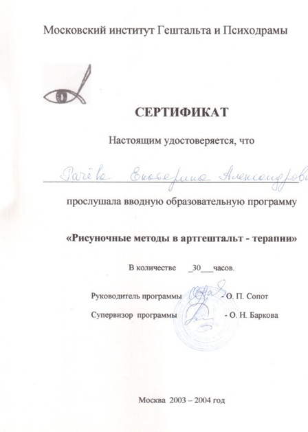 2004 г - Вводная образовательная программа "Рисуночные методы в артгештальт-терапии" (МИГИП, 30 часов)