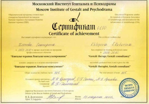 2015 г - Гештальттерапия и психодраматерапия в работе с клиническими нарушениями (30 ч.) МИГИП (Сертификат)
