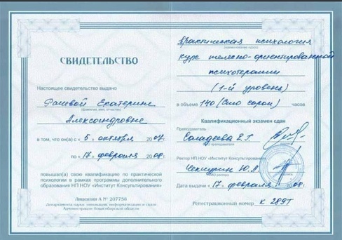 2008 г - Курс телесно-ориентированной психотерапии (140 часов) НП НОУ "Институт консультирования"