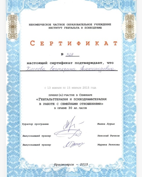 2015 г - Гештальттерапия и психодраматерапия в работе с семейными отношениями (30 ч.) МИГИП (Сертификат)
